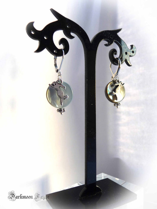 Athena's Owl and Crescent Moon Earrings. Cast Pewter Owl. Silver Plated Wires. Mother of Pearl.