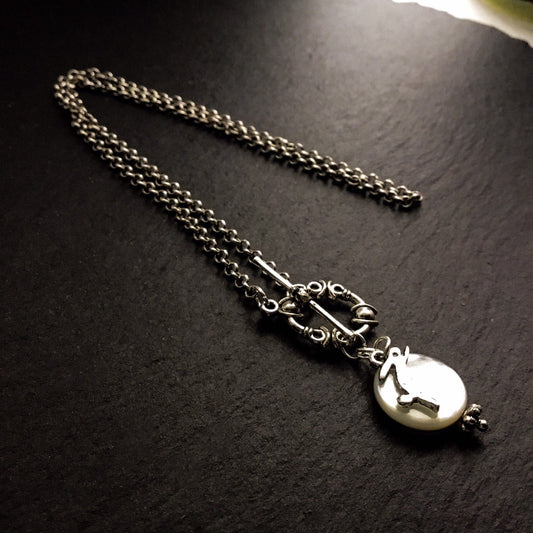 Freyja Full Moon Leaping Hare Necklace. Tahitian Black Oyster Shell with Toggle Clasp. Custom Length