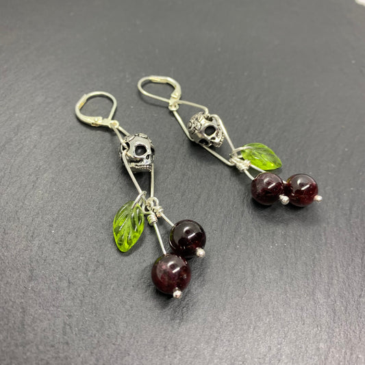 Cherry Skull Earrings With Pewter Rose Skulls In Silver And Garnet Beads