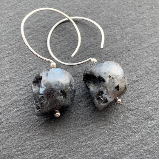 Legend of the Crystal Skull Hoop Earrings. Norwegian Larvikite. All 925 Sterling Silver.