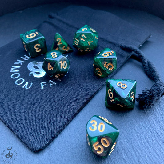 DnD 7 Dice Green Forest Dragon Dice Set With A Fairtrade Cotton Storage Pouch