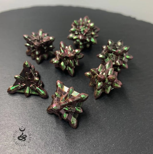 DnD Enchanted Necromancy Crystalline Shaped Solid Heavy Metal Polyhedral 7 Dice Set With A Fairtrade Cotton Storage Pouch (green/purple/magenta)