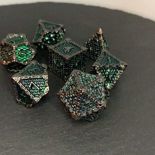 DnD Chromatic Green Dragonscale Solid Heavy Metal Polyhedral 7 Dice Set With A Fairtrade Cotton Storage Pouch (green/gunmetal)