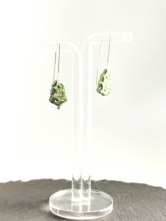 Christmas Tree Earrings. Green Dichroic Glass, Cut Crystal. 925 Silver Hand Forged