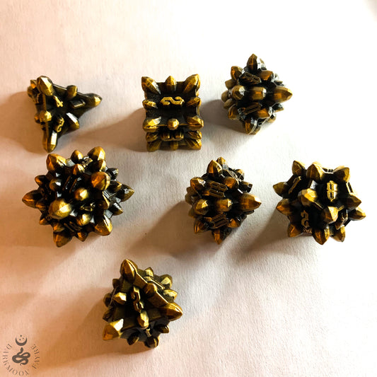 DnD 7 Paladins Oath Ancient Gold Crystalline Shaped Solid Heavy Metal Polyhedral Dice Set With A Fairtrade Cotton Storage Pouch
