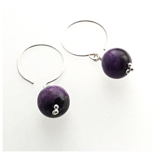 Charoite Hoop Earrings. All 925 Sterling Silver Hand Forged Ear-wires. Rare Natural Gemstone.