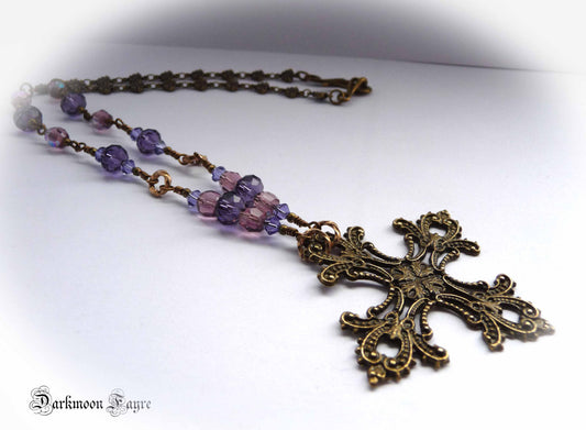 Gothic Cross Necklace. Purple and Lilac Cut Crystal & Fire Polished Glass. Antiqued Bronze