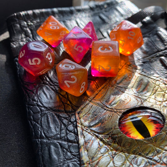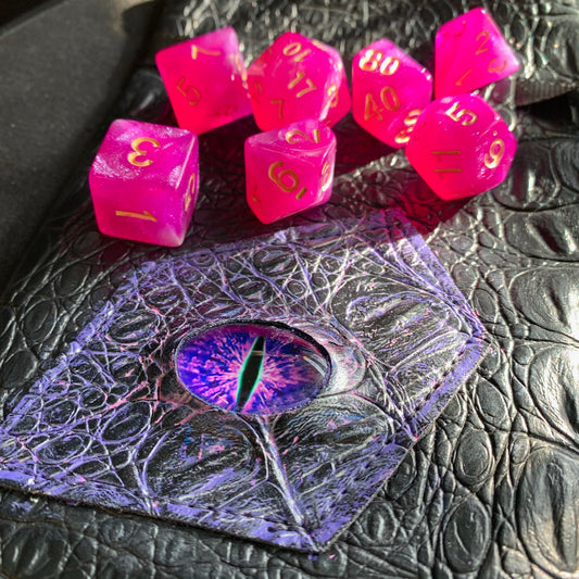 Eldritch Magenta Purple DnD 7 Dice Set And Hand Painted Dragon Eye Pouch In Vegan Leather