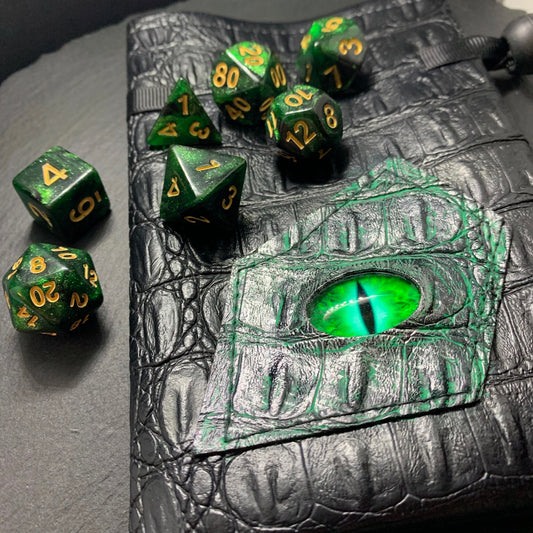 Green Conjuration DnD 7 Dice Set And Hand Painted Dragon Eye Pouch In Vegan Leather