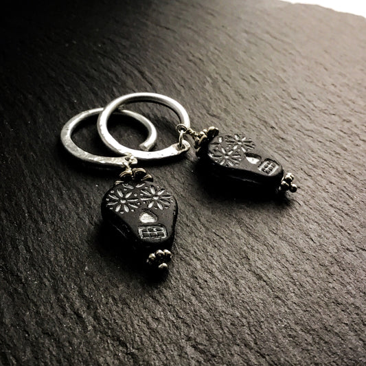 Sugar Skull Earrings for Stretched Ears. Black & White Matte Glass Skulls. Hand-forged Ear-Wires