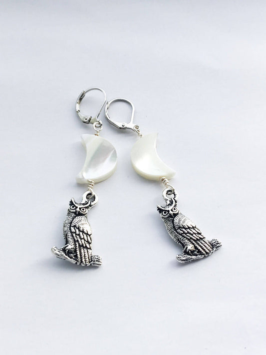 Athena's Owl and Crescent Moon Earrings. Cast Pewter Owl. Silver Plated Wires. Mother of Pearl.