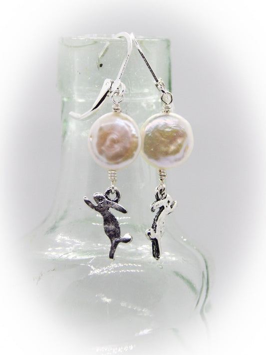 Freyja Freshwater Pearl Earrings With Hares & “Full Moons”. Sterling Silver Ear-wire option.