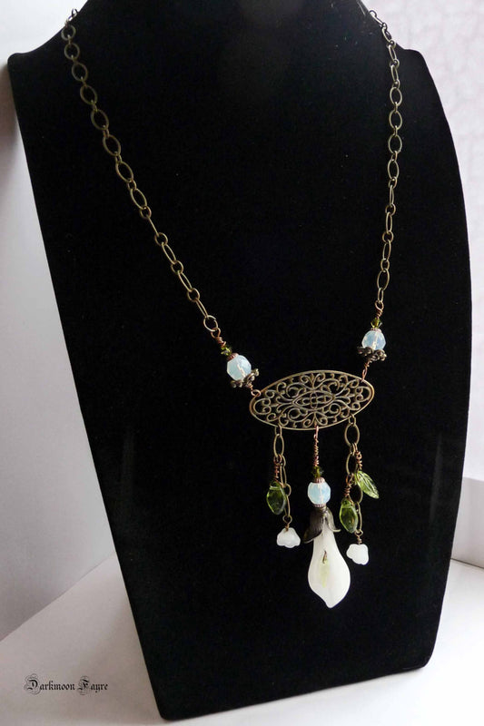 White Jade Calla Lilly Negligee Necklace. Art Nouveau inspired in antiqued bronze filigree.