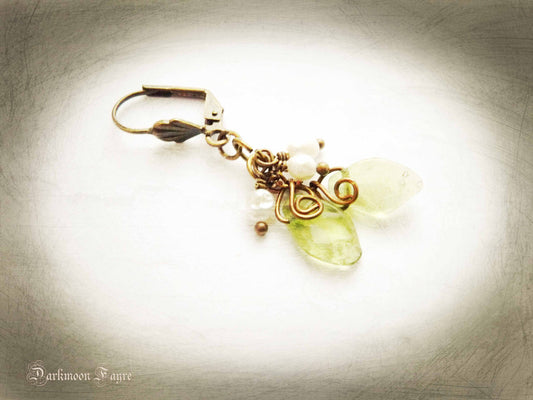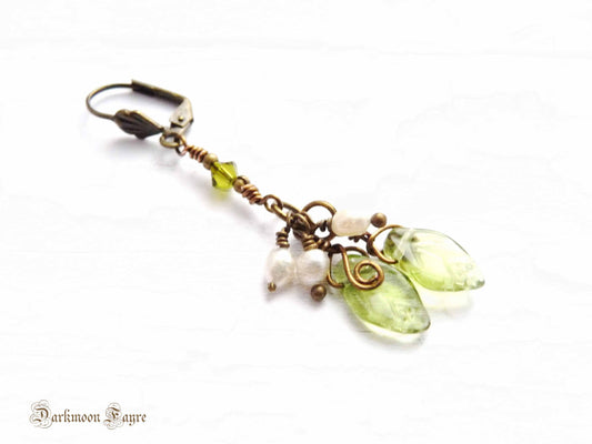 Mistletoe Earrings. Freshwater Pearl & Glass Leaves. Hand Wired Antiqued Bronze