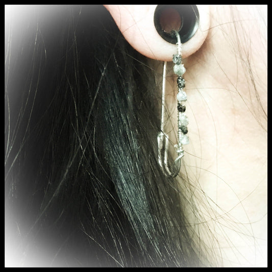 Black & Silver Raw Diamond Nugget Safety Pin (Single) Earring. All 925 Sterling Silver Hand Forged.