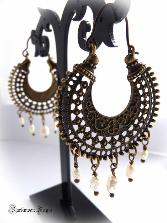 Antiqued Bronze Gypsy Hoops, Natural White/Ivory Freshwater Pearls. Hypo-allergenic Niobium Ear-wire