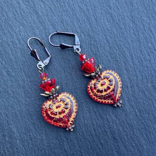ビクトリア朝のバレンタインイヤリング.レッドグラスハート&フラワーとカットクリスタル。ニオブイヤーワイヤーオプション