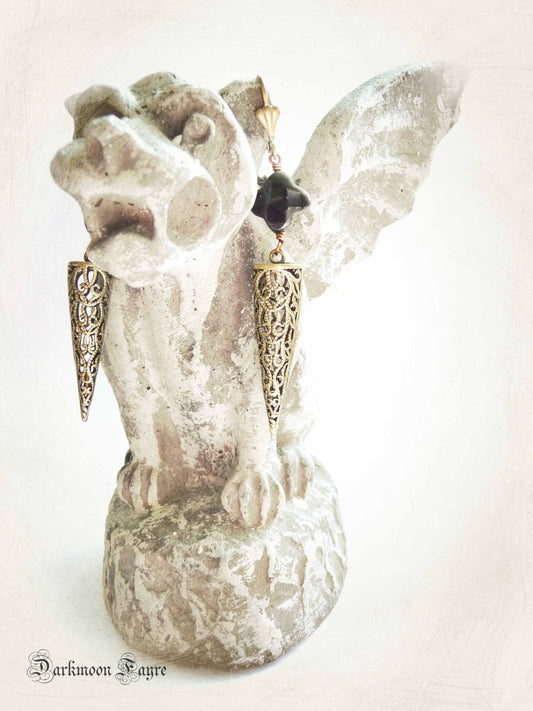 ドラゴングラスのピアス。ブロンズ フィリグリー スパイク/振り子。ナチュラルブラックオブシディアン火山ガラス