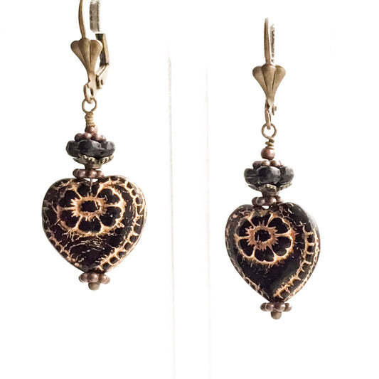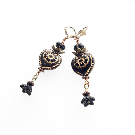 ビクトリア朝のバレンタインイヤリング.押された黒いガラスのハートと花。ニオブイヤーワイヤーオプション