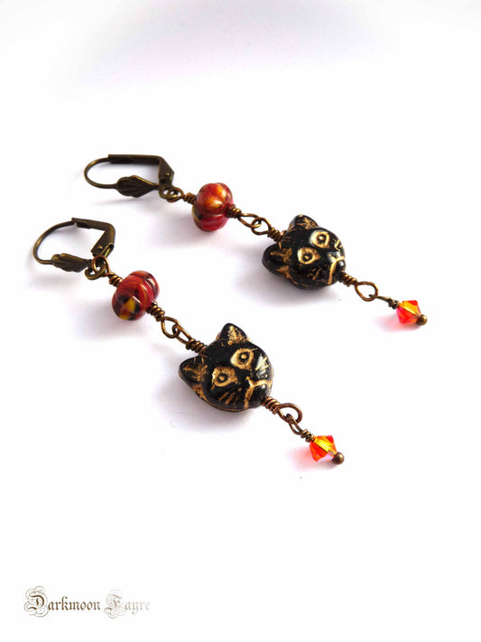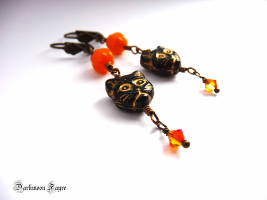 黒猫の顔とパンプキンブロンズのピアス。クリスタル ファイア オパールをカットします。プレスガラス。ハロウィン。