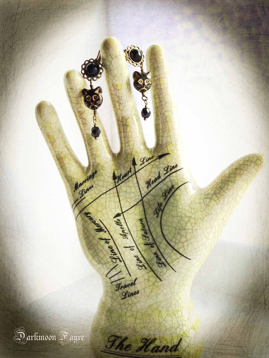 黒猫の顔のピアス。チェコプレスとファイヤーポリッシュのファセットガラス。アンティーク風ブロンズ