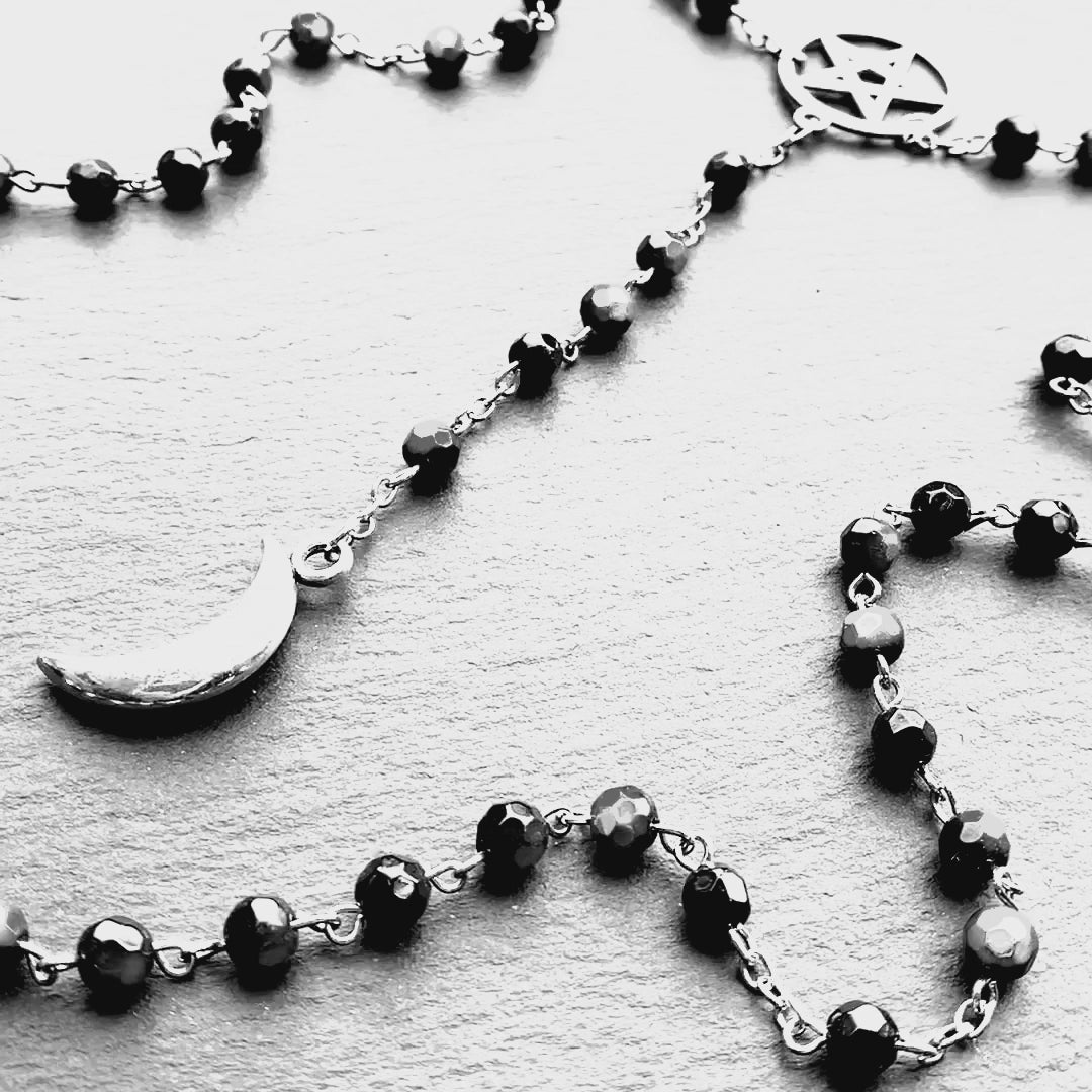 Witchy Gothic Long Rosary Necklace. Long Faceted Black Glass with Silver Pentacle and Crescent Moon